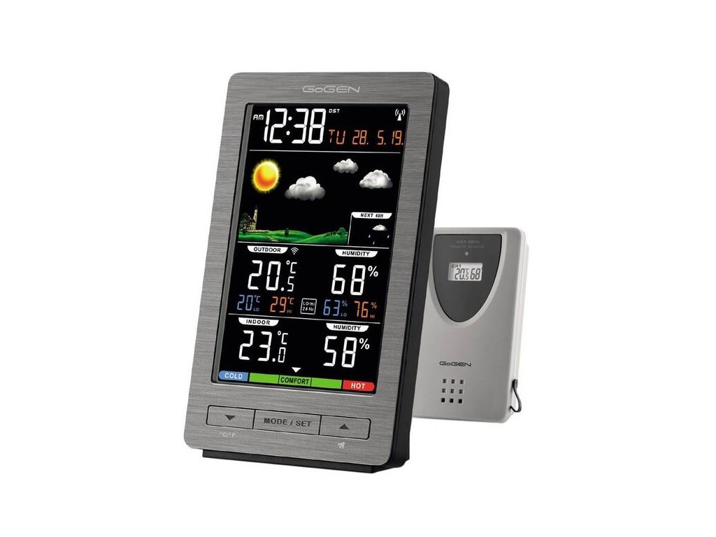 GoGEN ME 2930 je elegantní meteostanice s barevným LCD displejem a bezdrátovým senzorem. Nabízí animovanou předpověď počasí, zobrazení vnitřní i venkovní teploty a vlhkosti, ukládání maximálních a minimálních hodnot a alarm venkovní teploty. Samozřejmostí je datum, budík a čas řízený rádiovým signálem DCF 77.