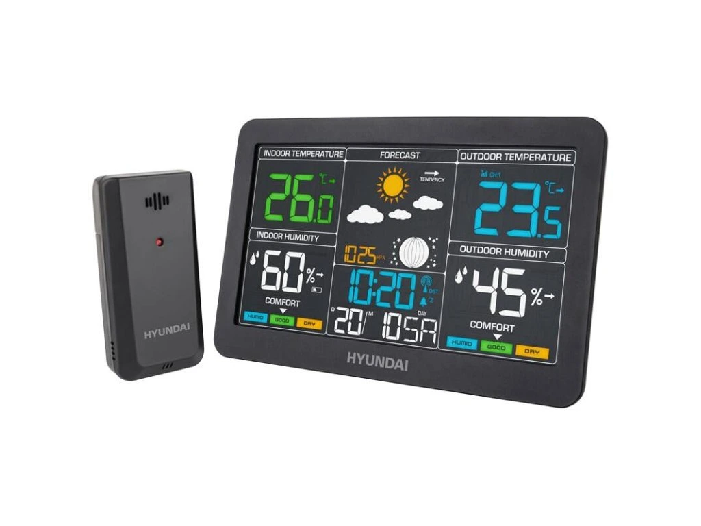 Mějte přehled o počasí doma i venku. Hyundai WS 4480 nabízí animovanou předpověď počasí, měření vnitřní i venkovní teploty a vlhkosti, barometrický tlak, fáze Měsíce, budík i kalendář. Umožňuje připojit až tři externí senzory a čas je řízen rádiovým signálem DCF 77.