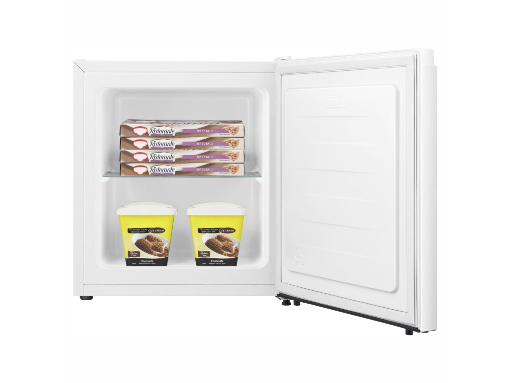 Mrazák disponuje možností otočení dveří a ukládání potravin na skleněnou polici.